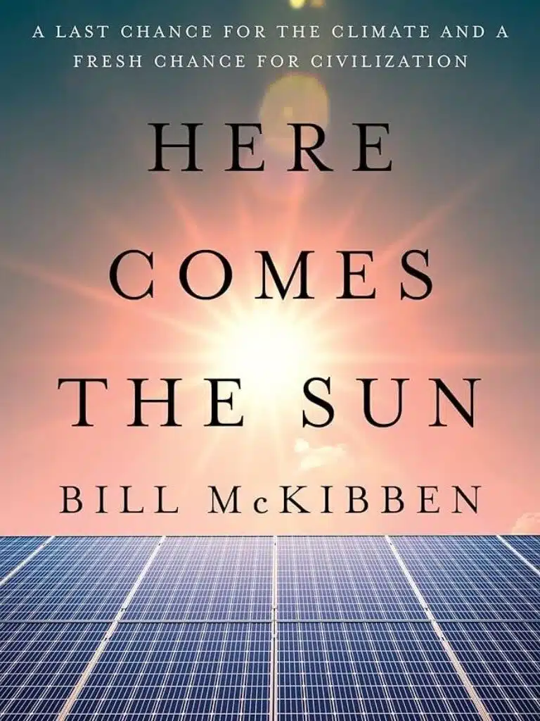 McKibben always takes the long view. He links our solar panels to humanity’s first control of fire, perhaps our one big difference from other animals. Now we are harnessing the power of the sun, the ultimate fire. The fires we need to eliminate are those caused by petroleum, gas, and coal.
