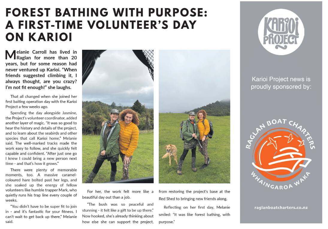 The Karioi Project, managed by A Rocha Aotearoa New Zealand, is a community-led conservation programme working to restore biodiversity across the Whāingaroa landscape. Focused on seabird protection, species monitoring, predator control, and environmental education, the project is restoring biodiversity and reconnecting people with the mauri of Mt Karioi and its surrounding landscapes.