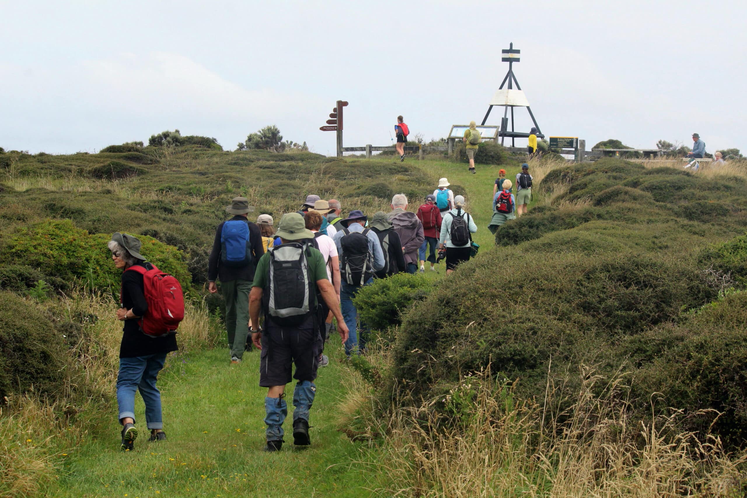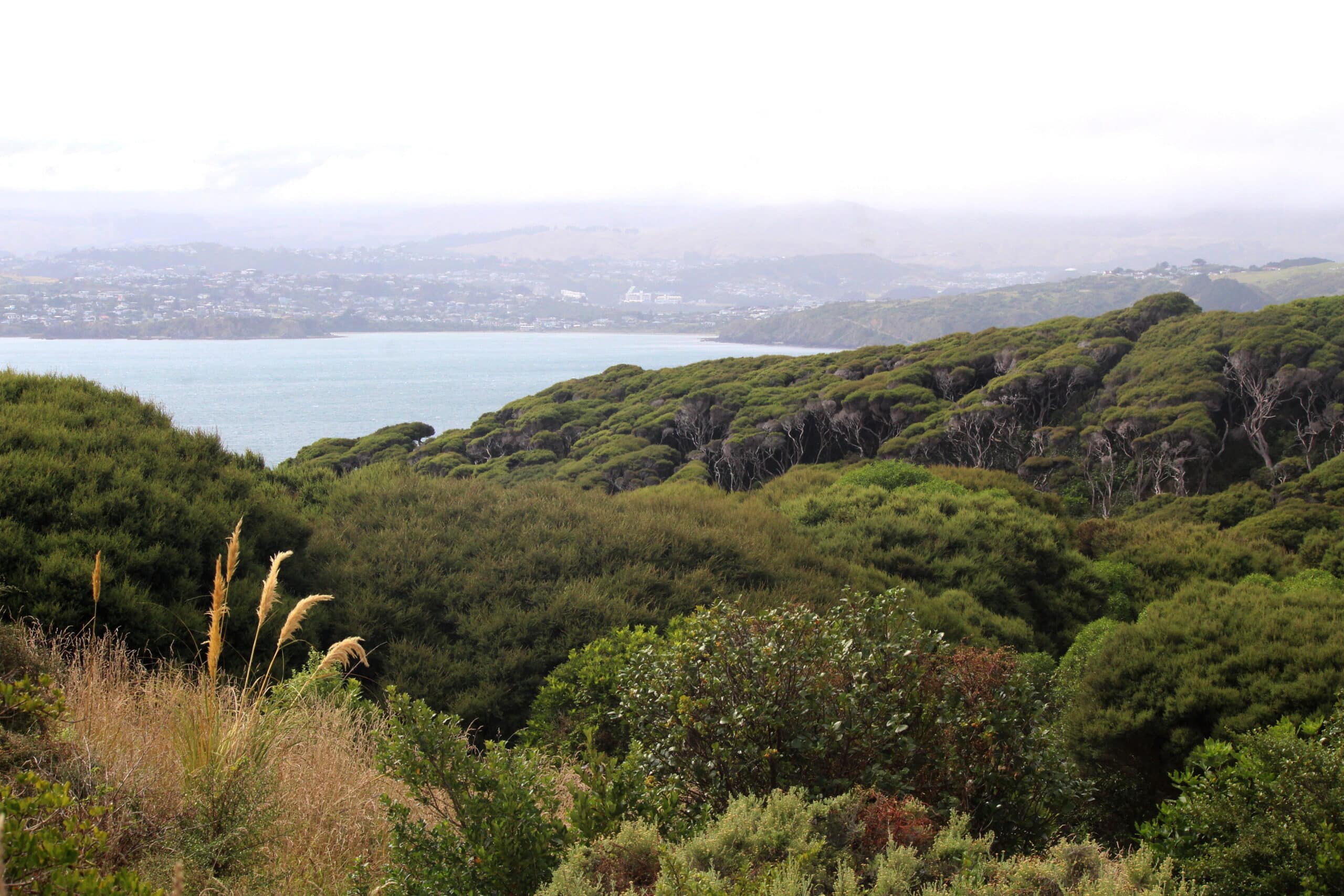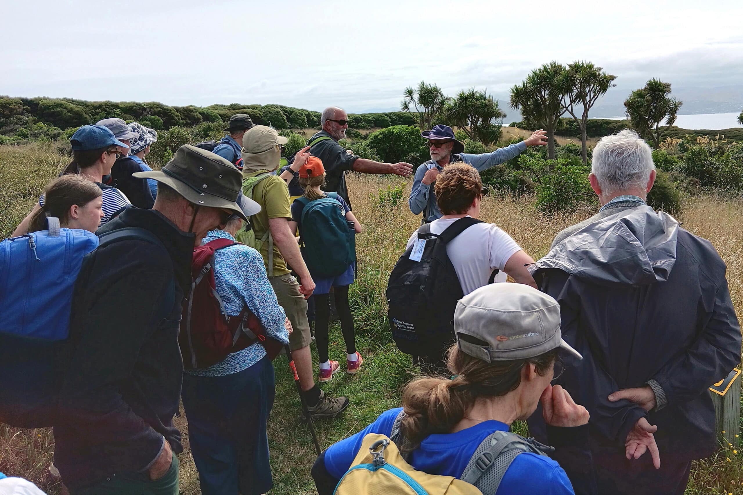 Of particular interest were the insights provided by members of the group into the challenges associated with restoring ecosystems on the island. For example, initially planting was aimed at reforesting the whole island with eco-sourced trees. However, as the island was being used to release takahe and geckos, a decision was made to leave the grassland in the upland areas, as food and habitat for them. Planting on the upland instead focused on scattered patches of shrubs such as Hebes and divaricating shrubs like Coprosma propinqua (see photo near the trig below). We enjoyed exploring both habitats.