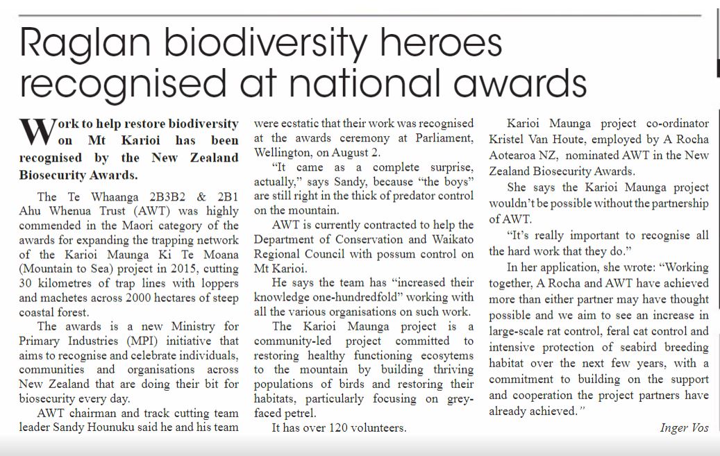 Biodiversity ranger Duncan Mackay volunteered for three years with the Karioi: Maunga ki te Moana project, before taking a 24-hours per week paid position with A Rocha Aotearoa NZ. This is a partner organisation working with hapu, landowners, other non-government organisations and community volunteers, to restore biodiversity on the mountain – or maunga – and around the town of Raglan.